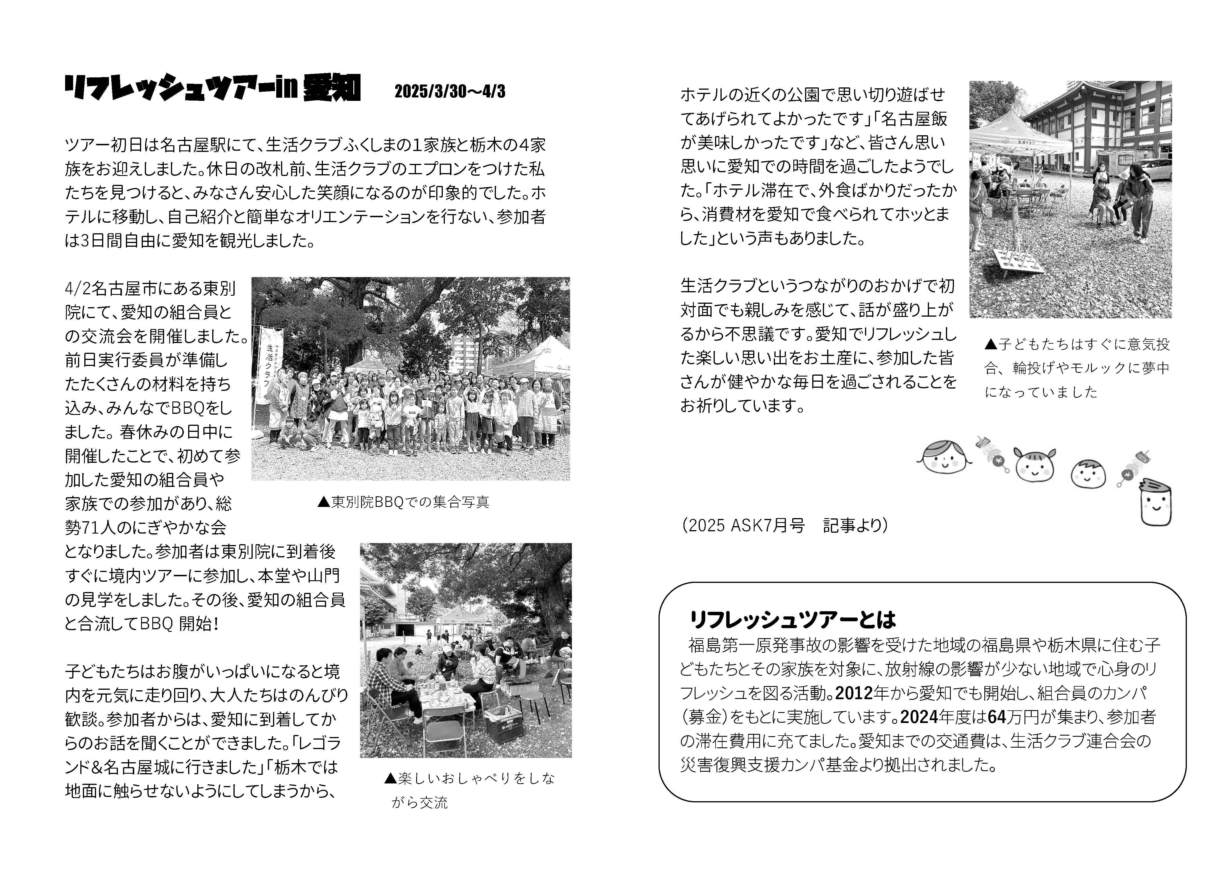 生活クラブふくしま及び栃木の組合員の保養とリフレッシュを目的に、単協ごとにリフレッシュツアーを実施してきました。