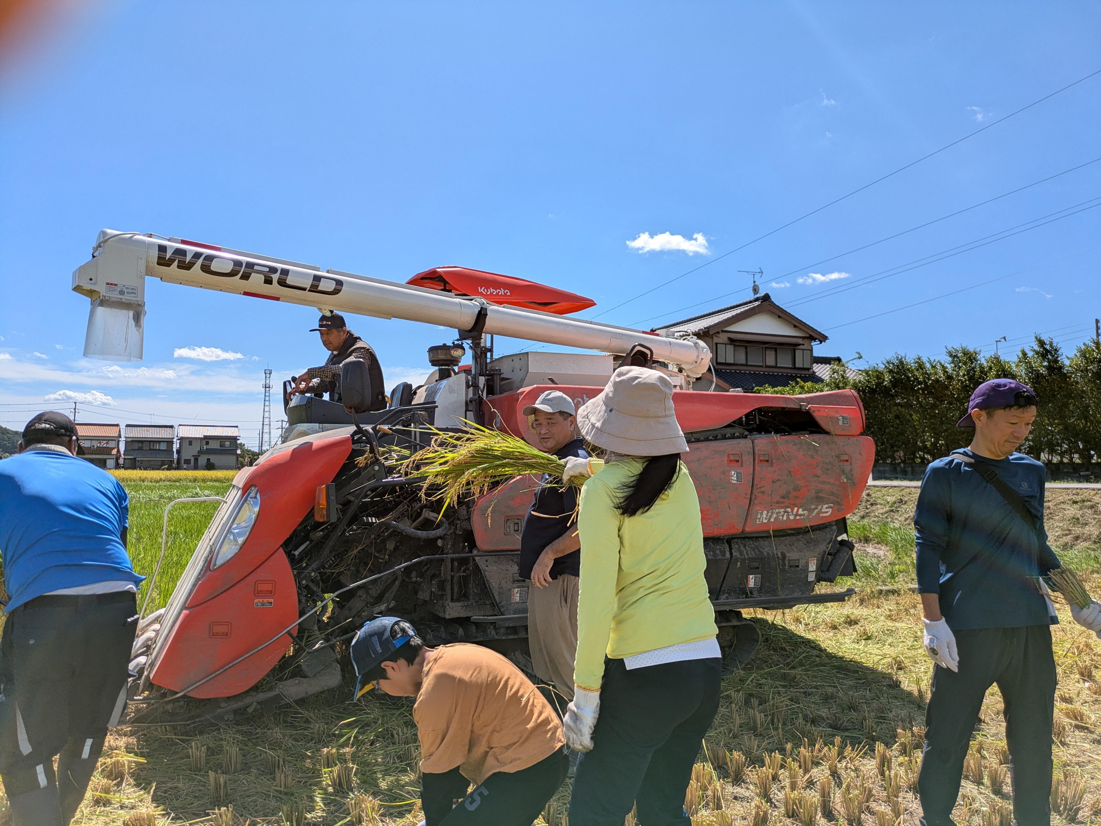 すべての稲を刈り終えた後、コンバインでの脱穀も見学。もみ殻が外れ、お米になっていく様子を興味津々で眺めていました。やりきった達成感から、その場に座り込む参加者の姿も見られました。