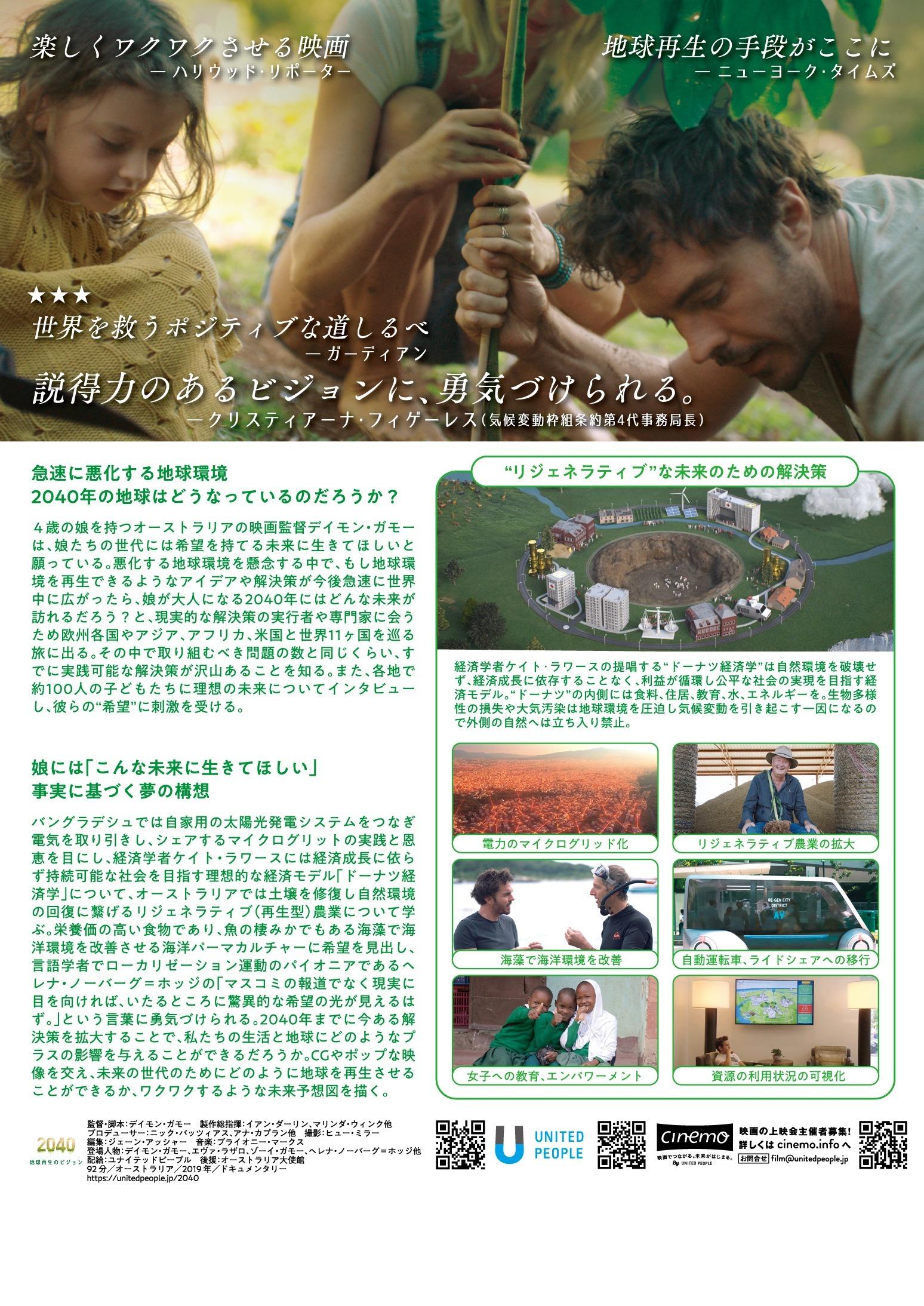 4歳の娘を持つオーストラリアの映画監督デイモン・ガモーは、娘たちの世代には希望を持てる未来に生き てほしいと願っている。悪化する地球環境を懸念する中で、もし地球環境を再生できるようなアイデアや解 決策が今後急速に世界中に広がったら、娘が大人になる 2040 年にはどんな未来が訪れるだろう?と、現実的 な解決策の実行者や専門家に会うため欧州各国やアジア、アフリカ、米国と世界 11 ヶ国を巡る旅に出る。そ の中で取り組むべき問題の数と同じくらい、すでに実践可能な解決策が沢山あることを知る。また、各地で 約 100 人の子どもたちに理想の未来についてインタビューし、彼らの“希望”に刺激を受ける。