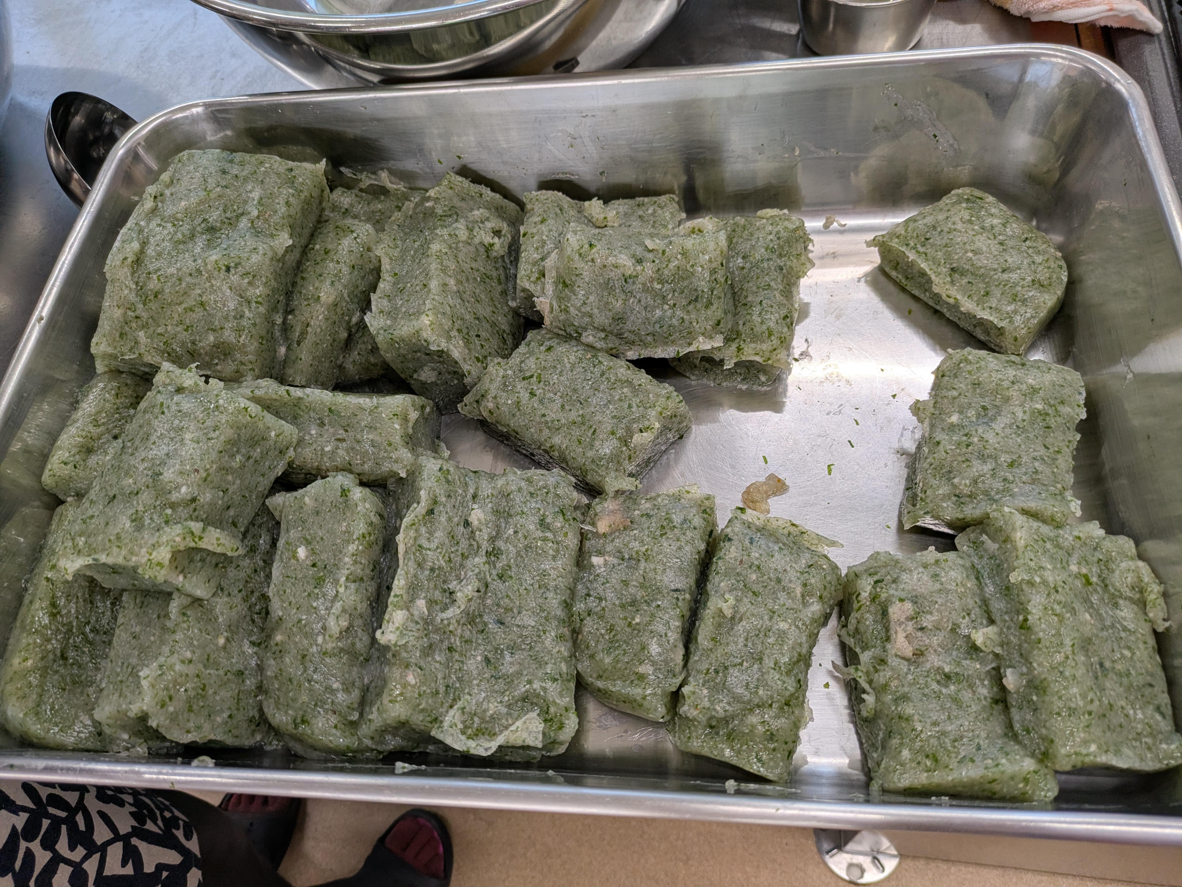 液状になったこんにゃく芋を火にかけながら練るところからが大変です。一人だったら、確実に翌日腕が筋肉痛です。とにかくみんなで交代し、協力して頑張りました。そして、成形して茹でて完成です!